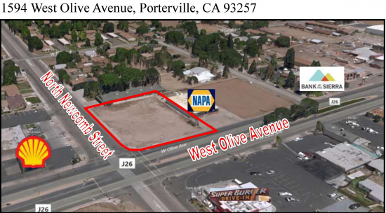 Centrally located serving all of Porterville and surrounding communities of Strathmore, Lindsay, Ducor, Terra Bella, Richgrove, Springville, Woodville and the Tule River Indian Reservation. Property situated at northeast corner of Newcomb Street and Olive Avenue just east of Newcomb Street. Full interchange just east of the property off Highway 65 and is situated in close proximity to Highway 190.