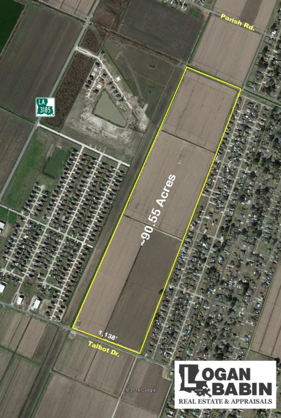 Prime tract of development acreage just West of Downtown Thibodaux that stretches from Talbot Drive north. Over 90 acres, currently all sugar cane with ~1,133 linear feet of road frontage on Talbot Dr. It also has stub outs connecting it to 4 other Parish roads. Property could have commercial usage on the Talbot frontage with residential development behind it.