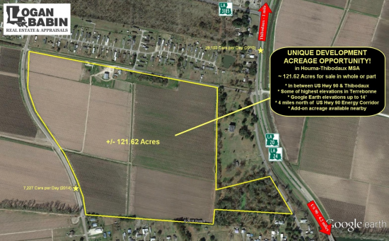 Come take advantage of this unique opportunity to shape the growing Houma-Thibodaux MSA with up to 121.62 acres available to purchase in Terrebonne and Lafourche Parishes. This tract lies just south of Thibodaux and north of US Highway 90 (Future I-49) and offers a variety of development choices from single-family residential, multi-family residential, commercial, retail, industrial, and/or hospitality.