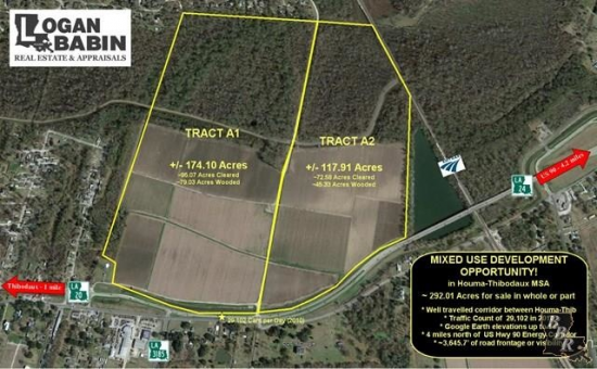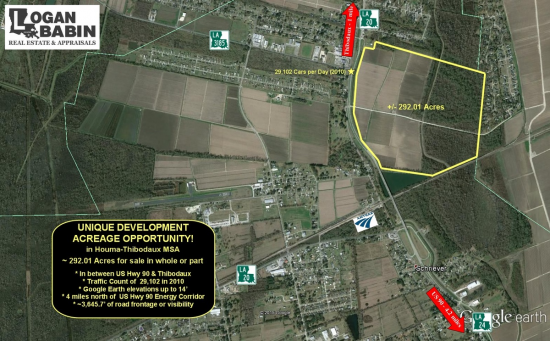 Come take advantage of this unique opportunity to shape the growing Houma-Thibodaux MSA with up to 292 acres available to purchase in Terrebonne Parish. This tract lies just south of Thibodaux and north of US Highway 90 (Future I-49) and offers a variety of development choices from single-family residential, multi-family residential, commercial, retail, industrial, and/or hospitality.