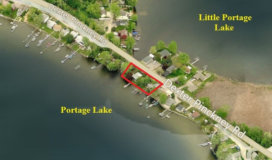Sale includes three parcels with two cottages, carport with tool house, boat house and storage shed. 160 feet of frontage on Portage Lake. 125` Artesian well and municipal sewer to both cottages. Mature trees and landscaping provide ample natural shade for property. Brick paver driveway, sidewalks and retaining walls. Both cottages have HVAC.