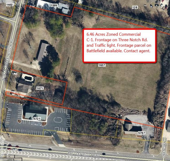 Easy access to the Three Notch/ Battlefield Parkway intersection. High traffic count. Parcel which would allow direct access to Battlefield Parkway may be available. See listing agent for information. 1,800 square foot 1964 rancher could also be used as commercial space.